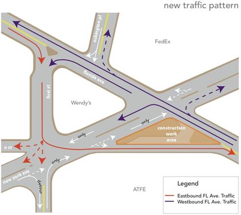 - Eastbound Florida Avenue traffic will be detoured to First Street. From there, drivers can go left at New York Avenue and right on O Street to return to Florida Avenue. (**Please note: this is a change from the original detour route announced last week.)