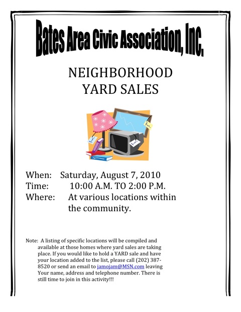 BACA yard sales Saturday! Posted on August 5, 2010 by Cary Rate this:Share this: Email a link to a friend (Opens in new window) Email Share on Facebook (Opens in new window) Facebook Print (Opens in new window) Print Like Loading...