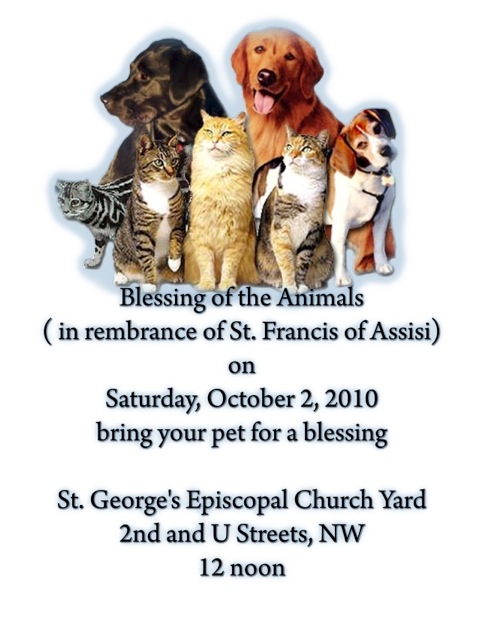 Blessing of the animals – Oct 2 Posted on September 24, 2010September 24, 2010 by Cary Rate this:Share this: Email a link to a friend (Opens in new window) Email Share on Facebook (Opens in new window) Facebook Print (Opens in new window) Print Like Loading...