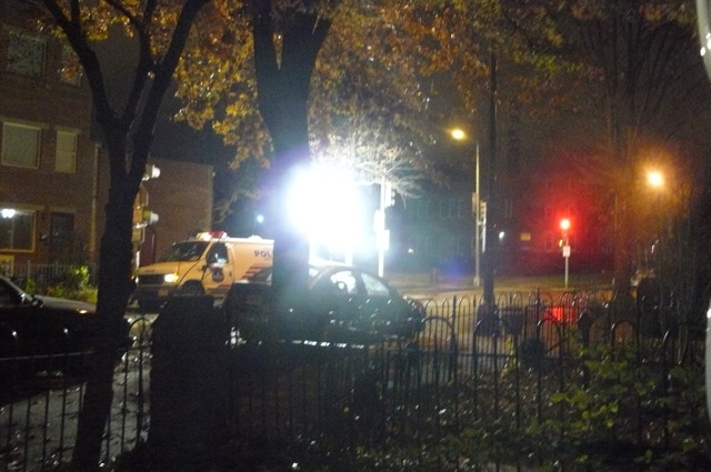 I live at 1st and P and for the past half hour at least there has been a police van with flood lights outside. I also saw a couple of cruisers in the area. The spotlights are highlighting the area where Jamal Wilson was murdered earlier this month.
