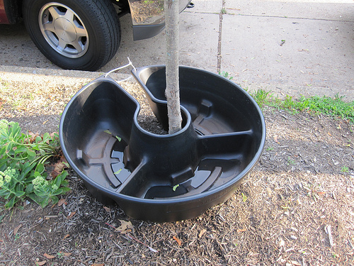 • New trees need to be watered DAILY. So if you have one of these, go ahead and fill it up. And pull away the mulch underneath it so that it waters the soil, not just the mulch on top.
