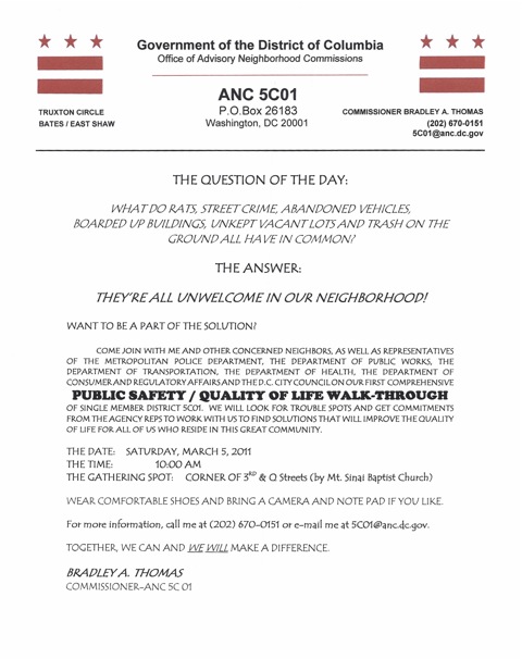 ANC 5c01 Public Safety Walk – Saturday @ 10 Posted on March 1, 2011March 1, 2011 by Cary Various DC Government Representatives will be walking through our area to hear our concerns. We hope you’ll join too. Rate this:Share this: Email a link to a friend (Opens in new window) Email Share on Facebook (Opens in new window) Facebook Print (Opens in new window) Print Like Loading...