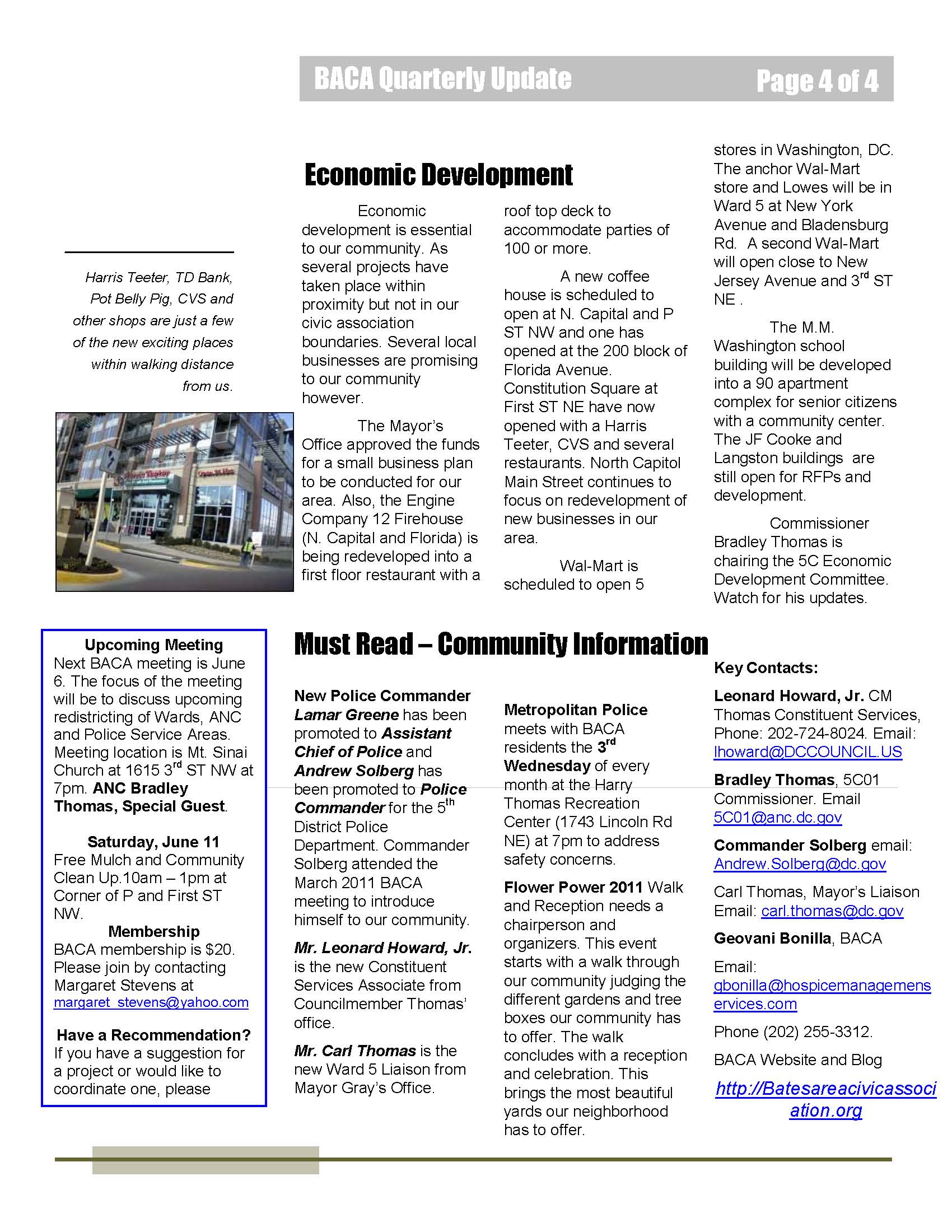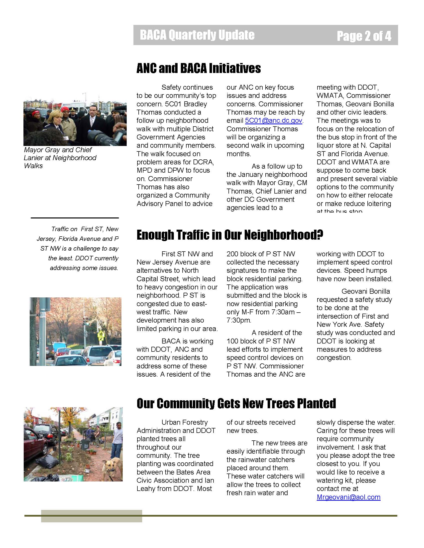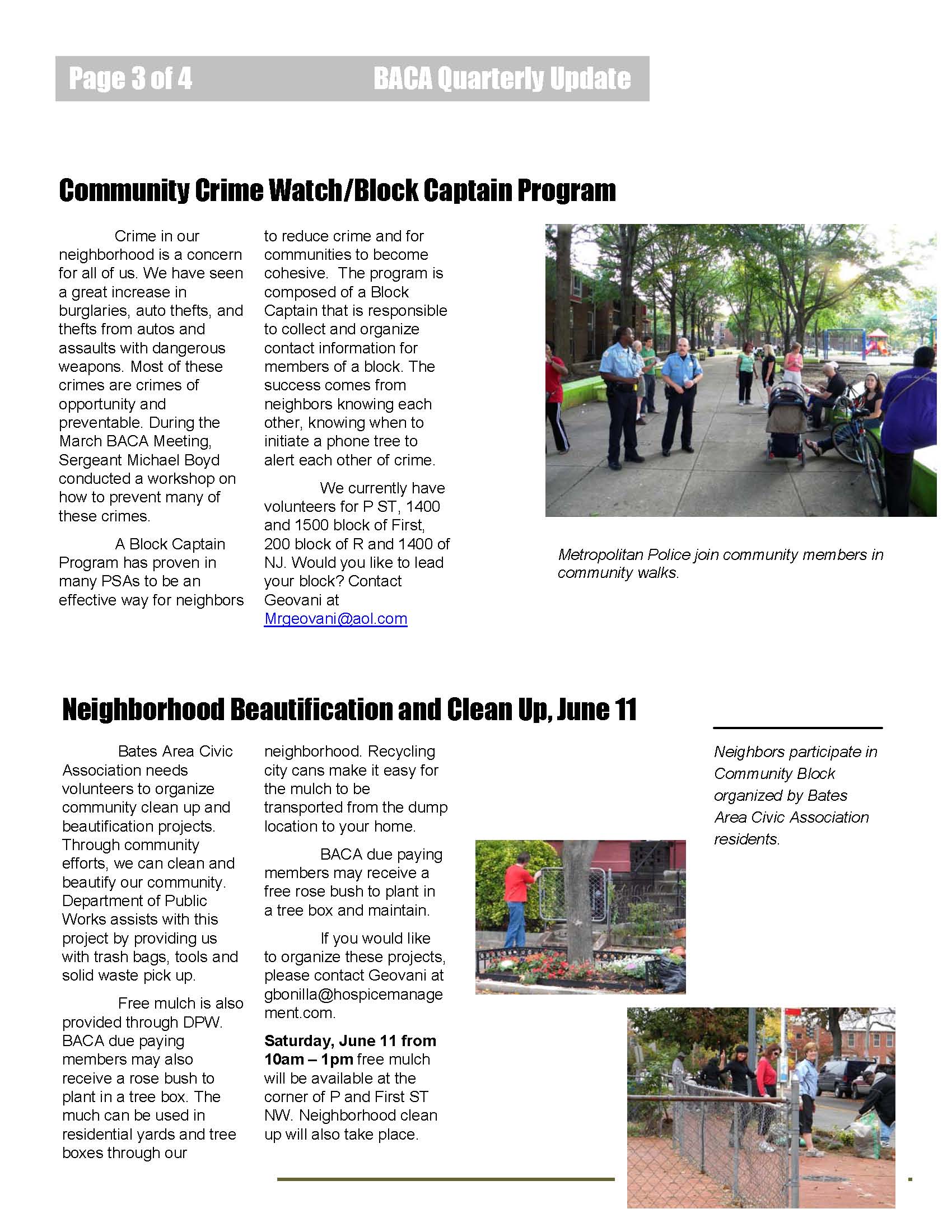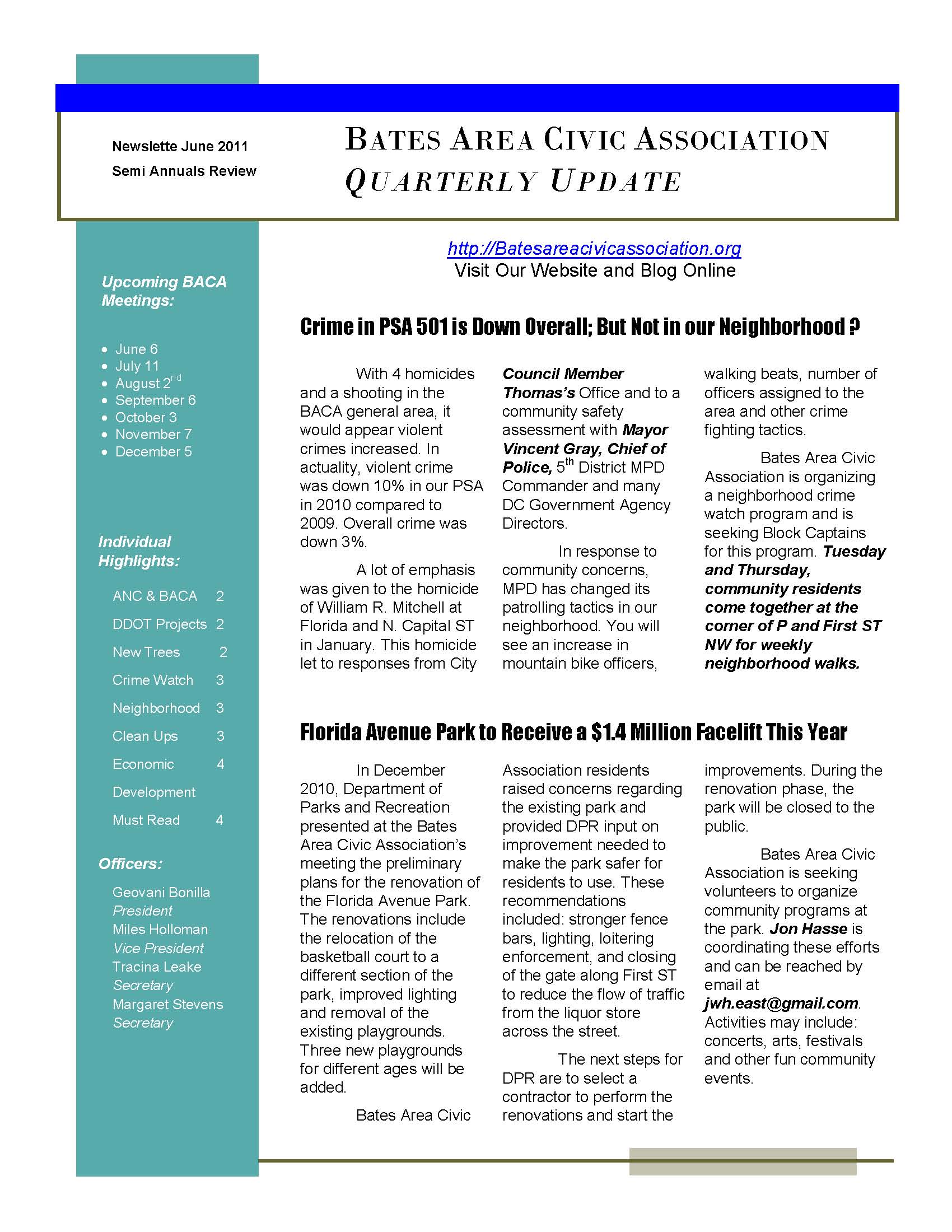 This is our first attempt to publish what I hope will be a quarterly newsletter. The purpose of the newsletter would be to inform all BACA residents of quarterly meeting schedules and to highlight the achievements and challenges we faced during the previous quarter. I understand it is difficult to attend every meeting and to stay informed of everything going on in our neighborhood, so this may be a great way to stay informed. We can solicit business to advertise in this publication to help cover the costs of printing a paper copy.