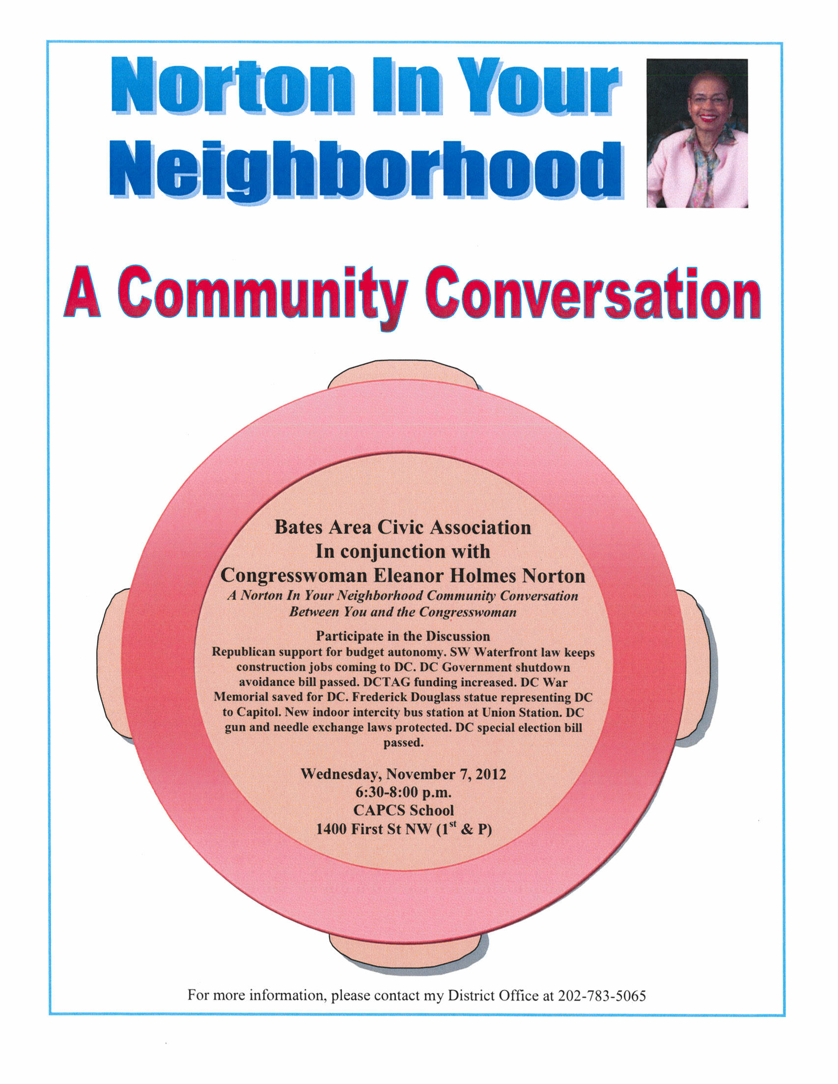 An Invitation From Congresswoman Norton and BACA Posted on October 31, 2012 by mrgeovani Rate this:Share this: Email a link to a friend (Opens in new window) Email Share on Facebook (Opens in new window) Facebook Print (Opens in new window) Print Like Loading...