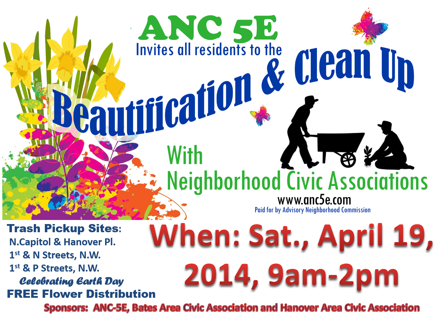 Again I will say, spring is in the air and it is time for our annual Neighborhood Earth Day Celebration. On Saturday, April 19, 2014, we would like all residents to come out and spend a few hours, cleaning and planting in our neighborhood. ANC5E is providing funding to