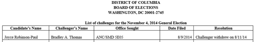 3 thoughts on “Bradley Thomas initially challenges Joyce Robinson-Paul’s ANC 5E05 SMD petition, but then withdraws the challenge