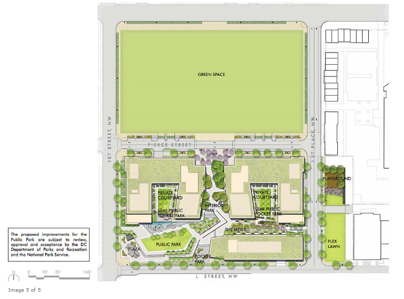 The development proposed by the Sursum Corda Cooperative Association and Boston-based Winn Development Company will be built on a site bordered by First, M and L Street NW, west of North Capitol Street (map). The project will consist of five residential buildings totaling 1,142 units, and will be built over two to three phases. It will be located on the site of Sursum Corda, a 199-unit non-profit housing cooperative built in 1968.