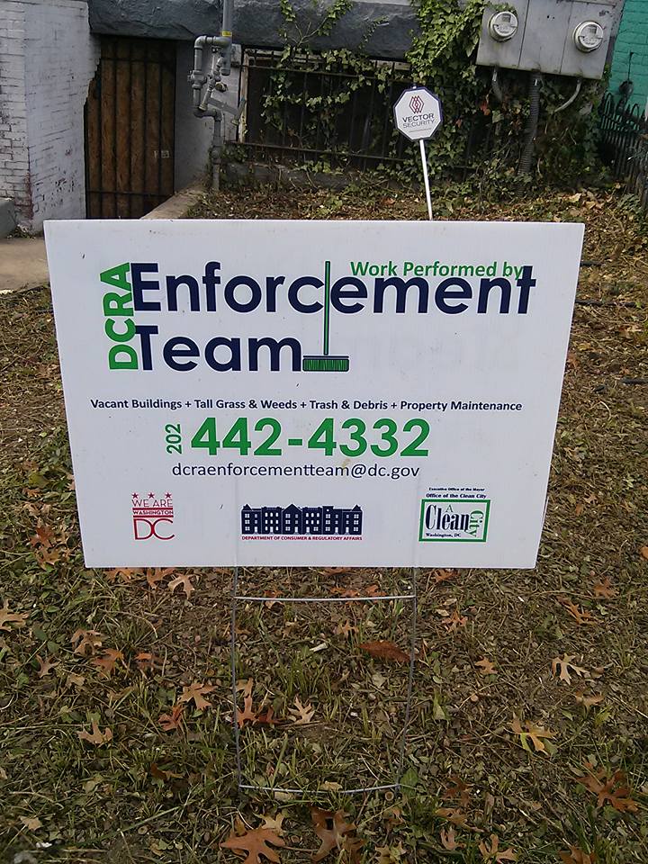 I’ve seen a few of these signs around the neighborhood recently – this one is from North Capitol just below Florida Ave, where they appear to have arranged for removal of tall grass and weeds. It looks like a more direct way to get some issues taken care of instead of going through 311. Contact info: 202-442-4332, dcraenforcementteam@dc.gov