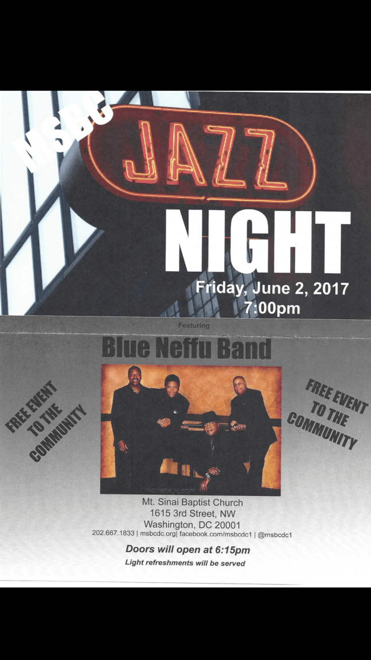 Free jazz concert at Mount Sinai Church: Friday night, June 2nd Posted on June 1, 2017 by christatxdc Sorry for the late notice, but please enjoy this entertainment and community event with our neighbors at Mount Sinai Baptist Church, 3rd and Q St NW. Rate this:Share this: Click to email a link to a friend (Opens in new window) Email Click to share on Facebook (Opens in new window) Facebook Click to print (Opens in new window) Print Like Loading...